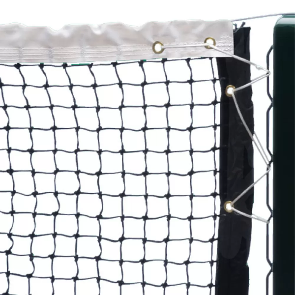 Trust one of the most recognized names in sports equipment to manufacture the ideal choice for your court. MacGregor® Varsity 300 Tennis Net 42’ withstands the rigors of even the most intense competitions at school, the club or community park. Black 2.5m twisted polyethylene boasts a breaking strength of over 225 lbs. The 5mm coated steel cable has a 3000 lb. test strength. Heavy-duty vinyl headband has 4 rows of lock-stitching to provide reinforcement and a 320 lb. tensile strength. Heavy-duty vinyl on sheath tapes on the bottom and sides. Also has center strap. MacGregor Varsity 300 Tennis Net measures 42’ L and includes side pockets.